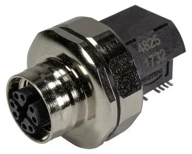 Leiterplattenadapter, mit integriertem Übertrager, gewinkelt, inkl. Flanschdose, Power over Ethernet (PoE+), für Frontmontage, Reflowlötanschluss (SMT), Bemessungsstrom: 0,8 A, Kontakte: 8, Messing, Au über Ni steckseitig, Kodierung: X-Kodierung, Liquid-crystal polymer (LCP), schwarz