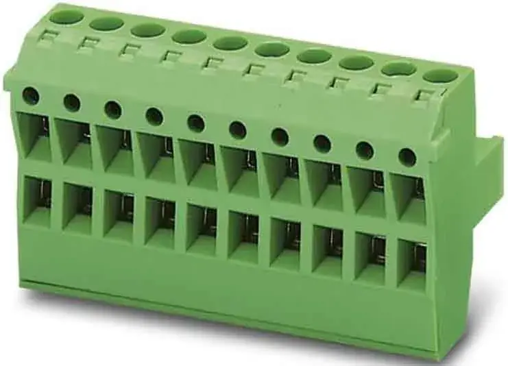 Leiterplattenstecker, Nennquerschnitt: 2,5 mm², Farbe: grün, Nennstrom: 12 A, Bemessungsspannung (III/2): 320 V, Kontaktoberfläche: Zinn, Kontaktart: Buchse, Anzahl der Potenziale: 2, Anzahl der Reihen: 1, Polzahl: 2, Anzahl der Anschlüsse: 4, Artikelfamilie: TMSTBP 2,5/..-ST, Rastermaß: 5,08 mm, Anschlussart: Schraubanschluss mit Zughülse, Schraubenangriffsform: L Längsschlitz, Anschlussrichtung Leiter/Platine: 0 °, Rasthaken: – Rasthaken, Stecksystem: COMBICON MSTB 2,5, Verriegelung: ohne, Befestigungsart: ohne, Verpackungsart: verpackt im Karton, Mit dem Stecker lassen sich Leiter von Modul zu Modul durchschleifen