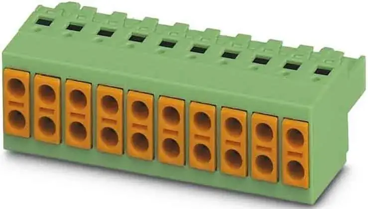 Leiterplattenstecker, Nennquerschnitt: 1,5 mm², Farbe: grün, Nennstrom: 10 A, Bemessungsspannung (III/2): 320 V, Kontaktoberfläche: Zinn, Kontaktart: Buchse, Anzahl der Potenziale: 7, Anzahl der Reihen: 1, Polzahl: 7, Anzahl der Anschlüsse: 14, Artikelfamilie: TVFKC 1,5/..-ST, Rastermaß: 5 mm, Anschlussart: Push-in-Federanschluss, Anschlussrichtung Leiter/Platine: 0 °, Rasthaken: – Rasthaken, Stecksystem: COMBICON MSTB 2,5, Verriegelung: ohne, Befestigungsart: ohne, Verpackungsart: verpackt im Karton